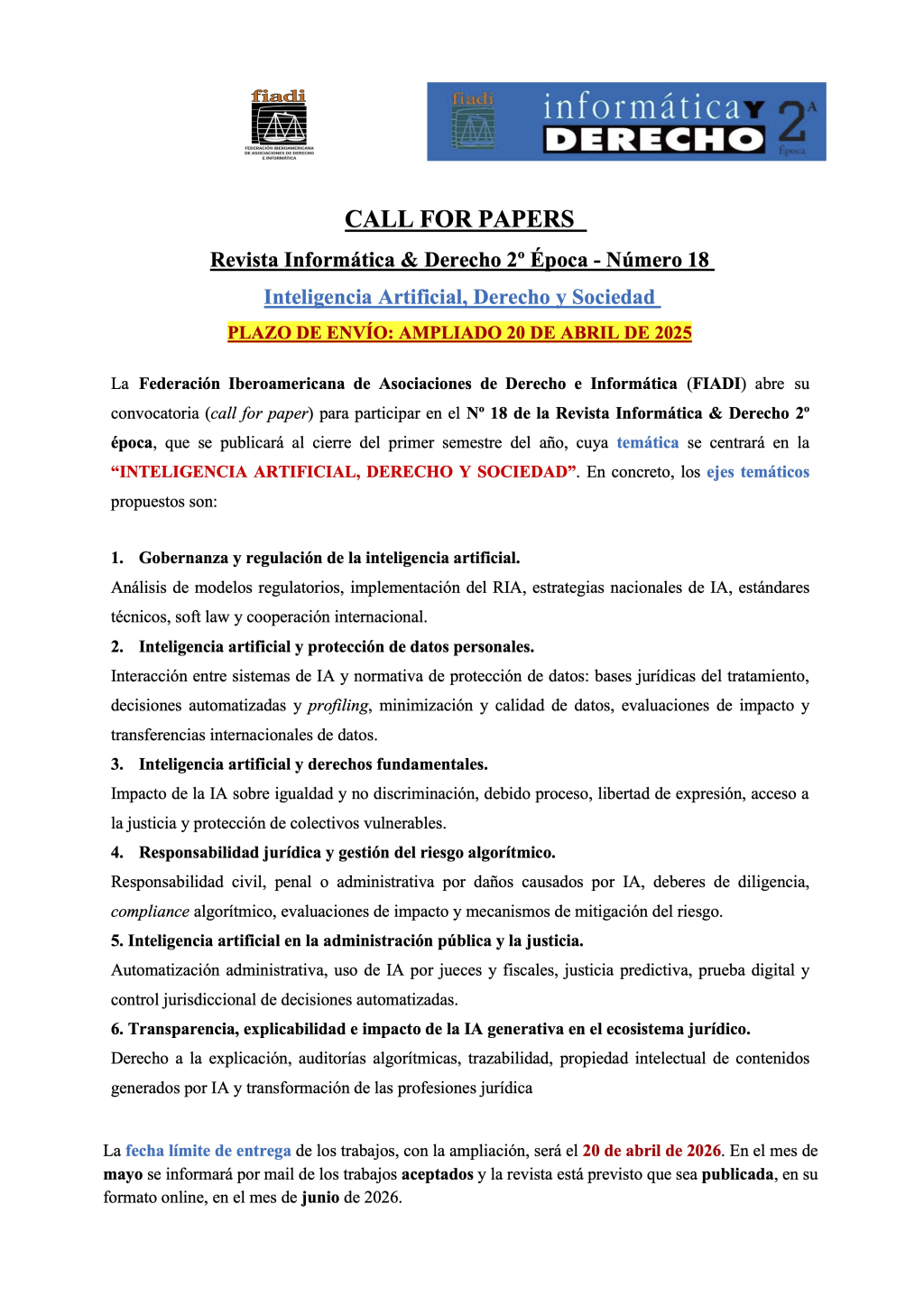CALL FOR PAPERS Revista Informática & Derecho 2o Época - Número 18 Inteligencia Artificial, Derecho y Sociedad PLAZO DE ENVÍO: AMPLIADO 20 DE ABRIL DE 2025